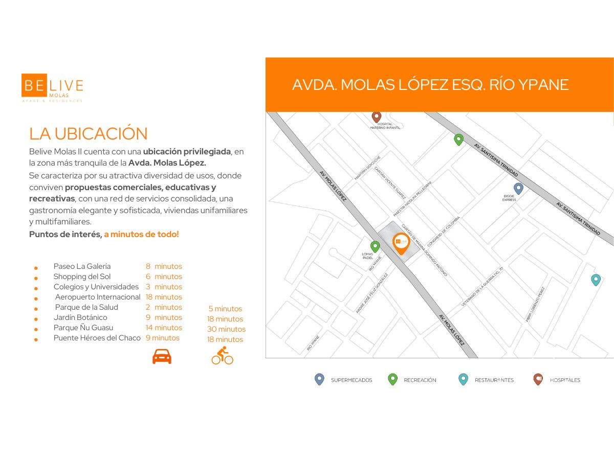 Ubicado en la estratégica Avda. Molas López esquina Río Ypane, en la tranquila y de alto crecimiento zona de Mburucuyá, este exclusivo departamento de 2 dormitorios es una inversión inigualable. A tan solo minutos de importantes puntos de interés como el Shopping del Sol (6 min), Paseo La Galería (8 min) y el Aeropuerto (18 min), así como del Jardín Botánico y varios colegios y universidades, se presenta como una opción ideal para quienes buscan un estilo de vida urbano y accesible en Asunción.